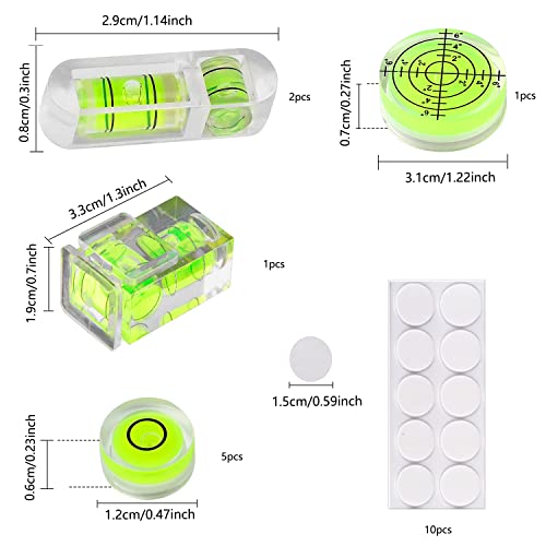 Pacchetto include: Livella a bolla piccola da 9 pezzi, 3 forme che puoi utilizzare in una varietà di situazioni. Con punti adesivi per un migliore fissaggio della livella.