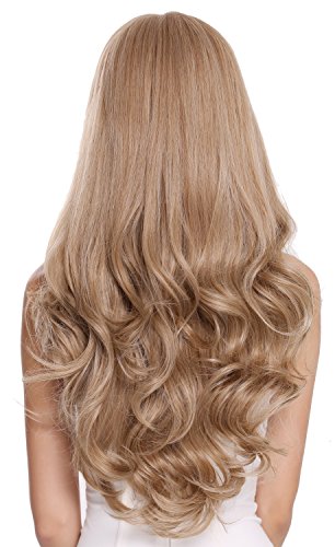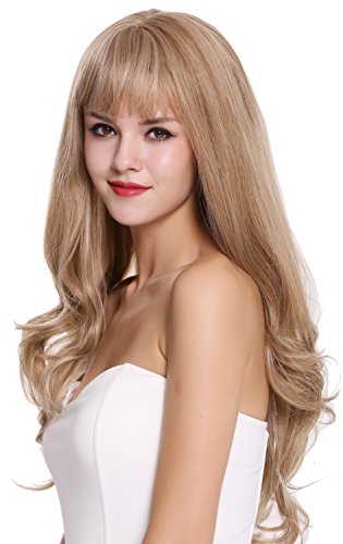 Meravigliosa parrucca da donna con splendida frangetta- i lunghi capelli scendono lisci per poi diventare ondulati. Il colore è un mix uniforme di biondo ramato scuro e biondo platino, senza un forte contrasto.