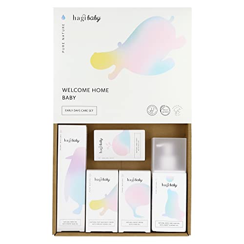 Hagi Baby Set per la cura del bambino | Welcome Home Baby | Set di 5 Prodotti per la cura del Bambino | Contiene Crema per il Corpo, Olio per il Corpo, Crema per il Viso, Sapone per Bambini