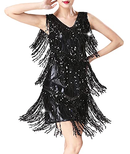 HAHAEMMA Abito da ballo da donna con nappe anni '20s con paillettes Rumba Dancewear Tango Latino Vestito Glitter Party Cocktail Abito da sera Ballroon Performance, Nero 1, XXL