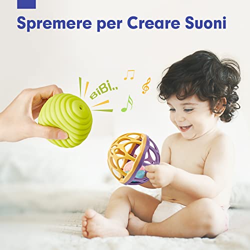 【Suono sonaglio】 Il bambino ama le palline morbide e leggere, che sono facili da contrarre ed espandere quando vengono schiacciate e creano suoni BB. Il giochi neonato 0-6 mesi viene fornito con un sonaglio premium, agitalo e crea un morbido suono di sonaglio che attira il bambino.