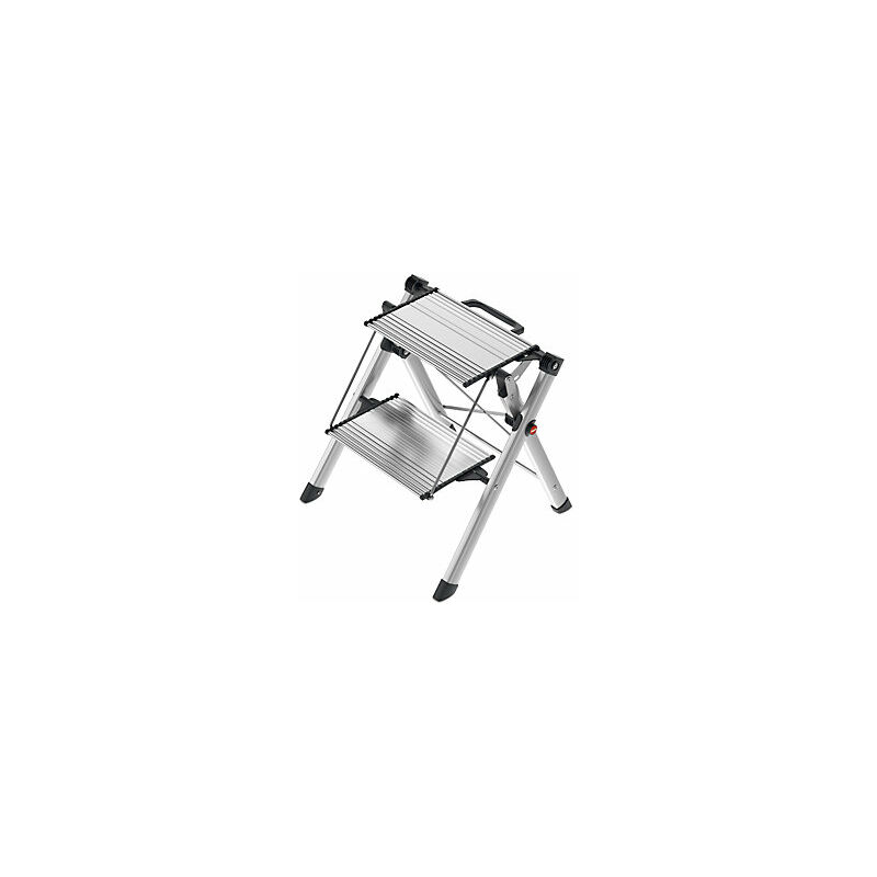 Scaletta pieghevole in alluminio MK80 ComfortLine, altezza piattaforma 440 mm, 2 gradini. Fornitura = montato. Caratteristiche = pieghevole. Salita = su un lato. N. gradini, piattaforma inclusa = 2 pz. Altezza piattaforma = 440 mm. Materiale telaio = alluminio. Materiale gradini = alluminio con rivestimento antisdrucciolo. Altezza totale = 450 mm. Profondità totale = 430 mm. Larghezza totale = 460 mm. Peso = 3.9 kg. Portata = 150 kg. Altezza di lavoro = 2440 mm. Impugnatura = senza. Scaletta salvaspazio, larghe solo 6,5 cm. Maniglia di trasporto con funzione di sblocco integrata. Due grandi gradini, con scanalatura antisdrucciolo. Piedini antiscivolo mandorlati per una stabilità ottimale. Ideale per impieghi occasionali in ufficio.