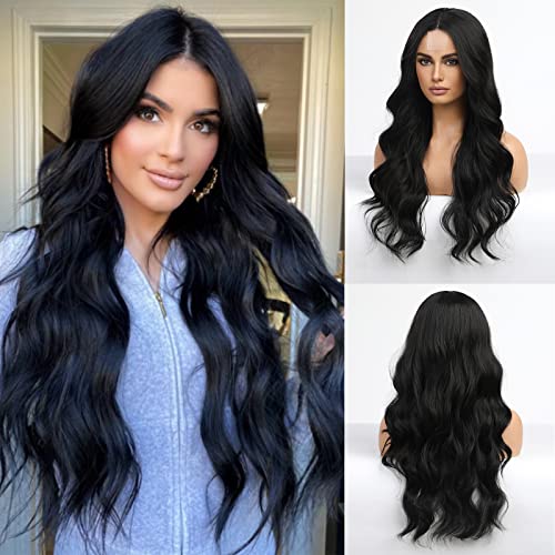 Haircube Parrucca da donna con capelli sintetici lunghi, ondulati, nera, con riga centrale, pizzo