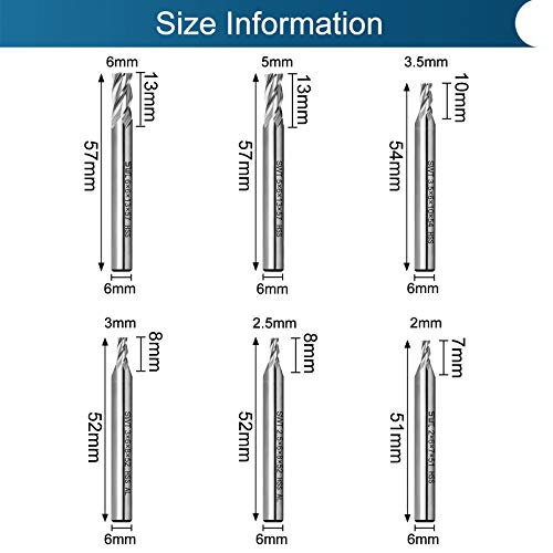 Set di 6 punte per trapano, a 4 scanalature. Dimensioni: 2 mm, 2,5 mm, 3 mm, 3,5 mm, 5 mm e 6 mm.