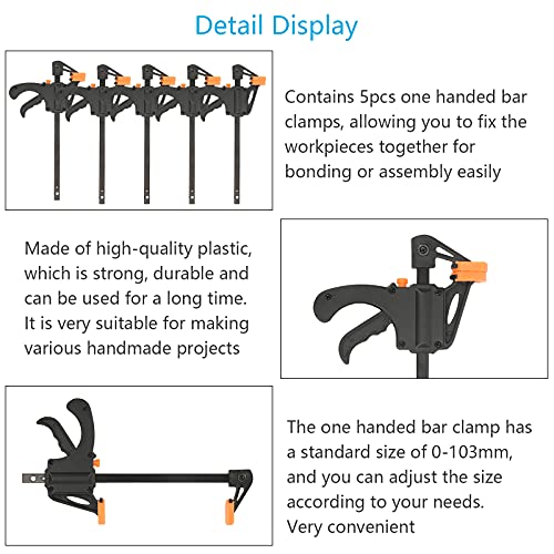 FORNITURA:Questo set contiene 5 pezzi di morsetto a una mano. Dimensioni 4 pollici, profondità di serraggio 3,6 cm, distanza massima di serraggio 10,3 cm. Bel set per le tue diverse esigenze.