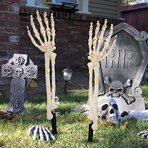 LED Halloween Decorazione Horror, 2 Pezzi Braccia Scheletro con 40 Luci Bianche Calde e Timer, Decorazione per Feste di Halloween all'aperto per Giardino Esterno Lapide