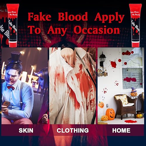 Adatto a molti scenari: Il nostro sangue finto è adatto per creare effetti speciali spaventosi e realistici in occasione di Halloween, case infestate, carnevali, festival e teatri! Perfetto per gli appassionati di film horror e per gli assassini in costume di Halloween per creare trucchi per zombie, mostri vampiri e altre scene cruente.