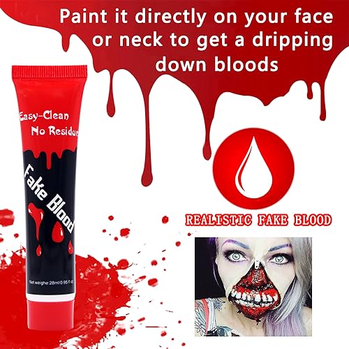 Facile da usare: Il nostro sangue finto è facile da usare: basta spremere delicatamente il tubetto per distribuirlo uniformemente sulla pelle. Può coprire tutte le parti del corpo ed è realistico come il sangue vero. Per rimuovere il trucco è sufficiente lavarlo delicatamente con acqua e sapone.