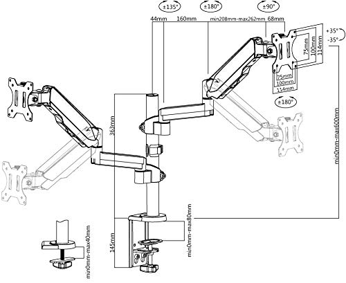 Massima Portata 8 kg per dispositivo (molle a gas regolabili 1 - 8 kg di resistenza, impostate su monitor leggeri alla consegna), il supporto è girevole a 360° e inclinabile fino a +/- 45°