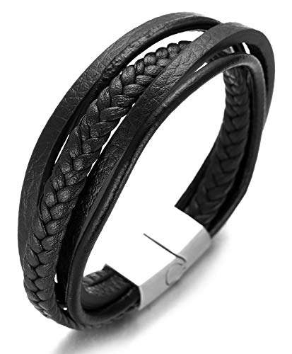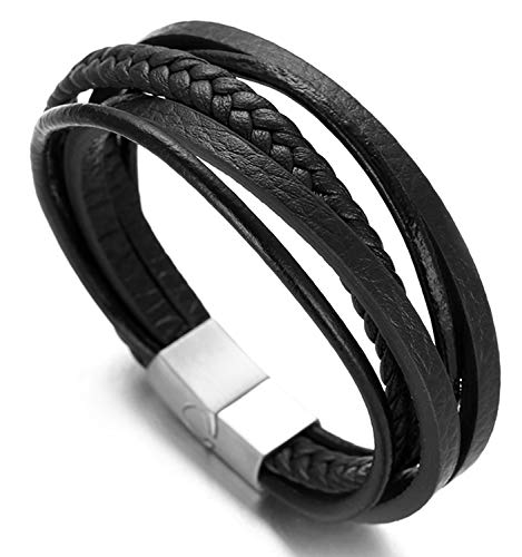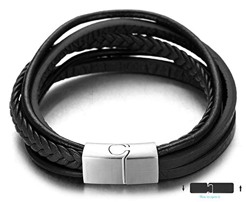 HALUKAKAH Basics ● Viaggio Stradale ● Bracciale Uomo in Vera Pelle Cuoio Nera Multistrato Chiusura Magnetica in Titanio Acciaio Argento 8"(20.5cm) con Pacco Regalo Gratuita