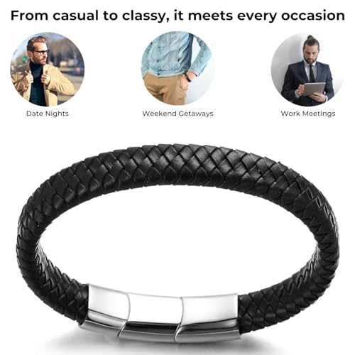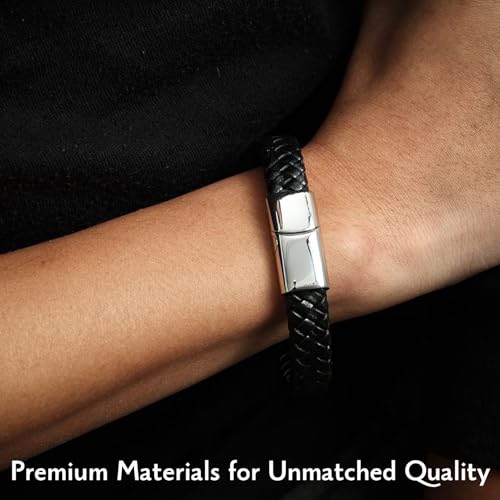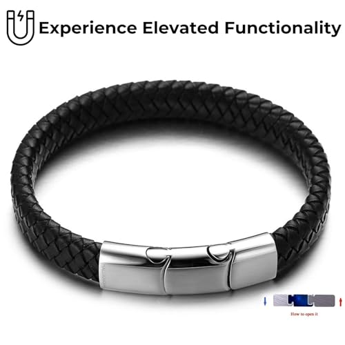 HALUKAKAH Plus ● Solo ● Bracciale Uomo in Vera Pelle Cuoio Nero Titanio Acciaio Chiusura Magnetica Argento Taglia Regolabile 8.46"-9"(21.5-23cm) con Pacco Regalo Gratuito