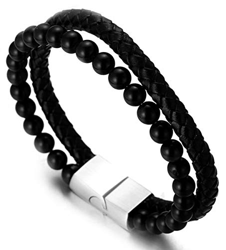 HALUKAKAH ● Saluta La Notte ● Bracciale Uomo in Vera Pelle Cuoio Multistrato Perline in Pietra Naturale Ossidiana Magnetico Chiusura 8"(20.5cm) con Pacco Regalo Gratuita