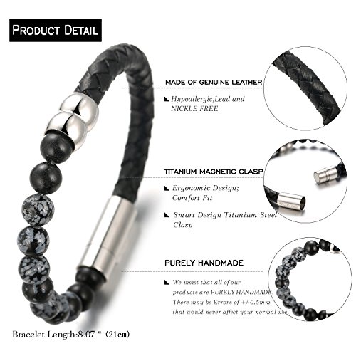 HALUKAKAH ● Saluto Il Terra ● Bracciale Uomo in Vera Pelle Cuoio con Fiocchi di Neve Ossidiana,Intelligente Chiusura Magnetica, 8.46"(21.5cm) con Pacco Regalo Gratuita