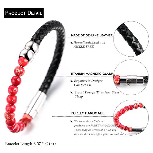HALUKAKAH ● Saluto Il Vita ● Bracciale Uomo in Vera Pelle Cuoio con Perline di Pietra Imperiale Rossa Naturale Intelligente Chiusura Magnetica 8.46"(21.5cm) con Pacco Regalo Gratuita