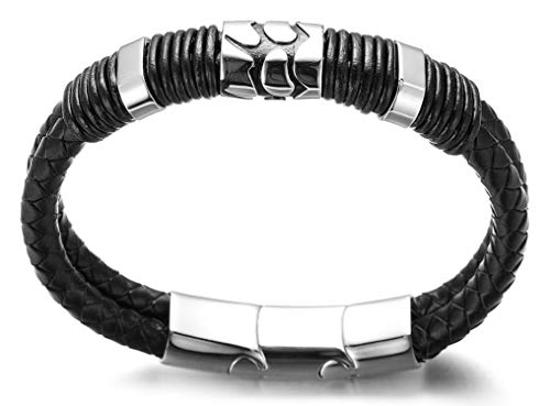 HALUKAKAH ● Vulcano ● Bracciale Uomo in Vera Pelle Cuoio Chiusura Magnetica in Titanio Acciaio Argento/Nero 8.46"(21.5cm) con Pacco Regalo Gratuita