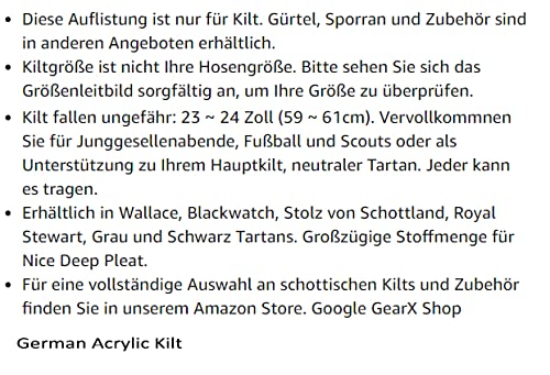 L'elenco è solo per Kilt. Sporran, cintura e spilla non sono inclusi. Sono acquistabili separatamente in negozio.
