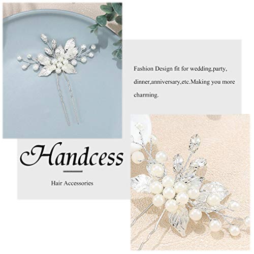 Handcess - Forcine per capelli da sposa con perle, con foglie argentate e strass;