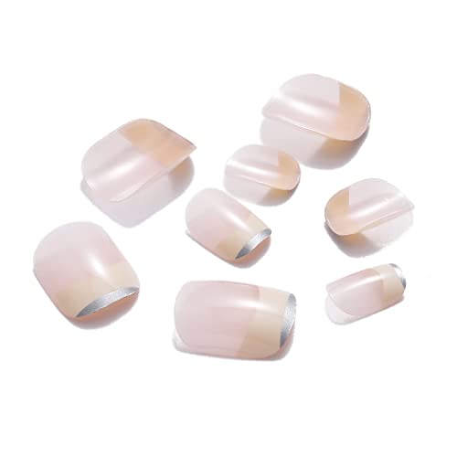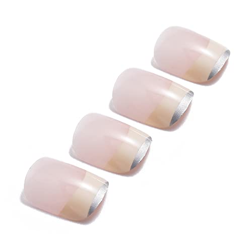 Handcess Unghie finte francesi quadrate Unghie corte lucide a pressione Bordo d'argento unghie finte acrilico Stick on Nail 24Pcs per le donne e le ragazze