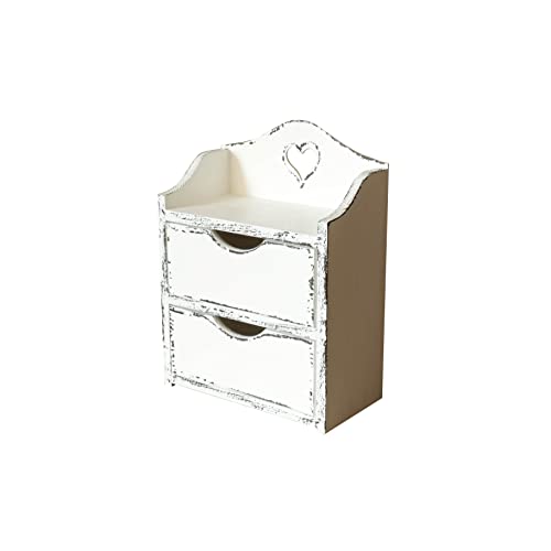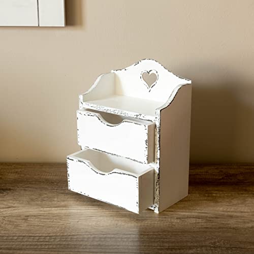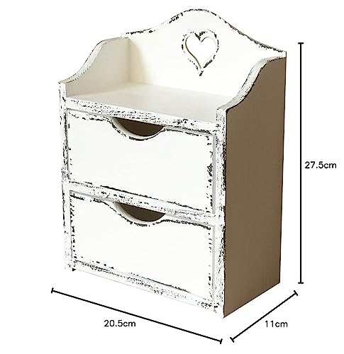 HANDKADECOR Mini cassettiera in legno con due cassetti e cuore - bianco Shabby Chic, organizzatore in legno. Organizzatore da scrivania - Portagioie