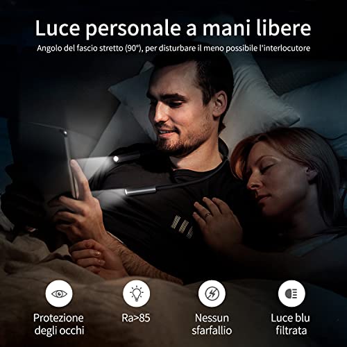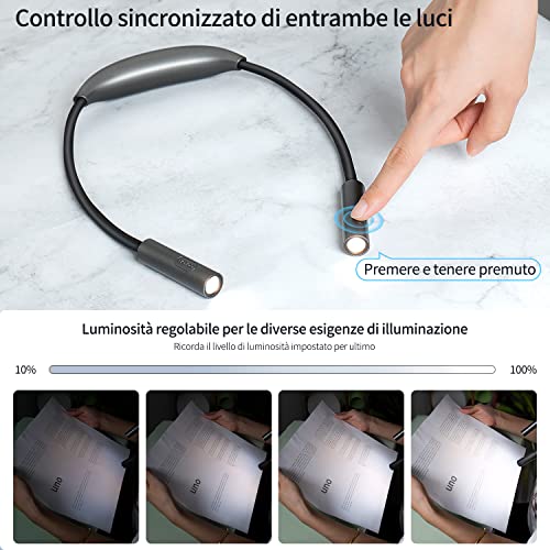 Ricaricabile e di lunga durata: questa luce da collo ha una batteria ricaricabile integrata da 1000 mAh. Dopo una carica completa, può durare per 5-200 ore. Contenuto della confezione: 1 luce da lettura, 1 cavo di ricarica USB di tipo C, 1 manuale utente (lingua italiana non garantita). Nota: adattatore di alimentazione non incluso. Può essere caricato da qualsiasi caricatore USB 5V/1A, porta USB del computer portatile o power bank. Si prega di caricare completamente prima dell'uso.