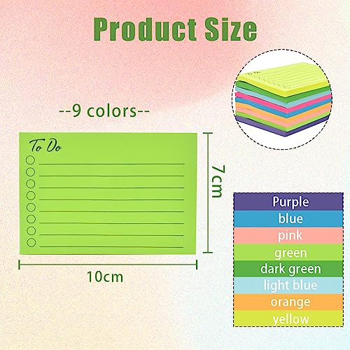 【SET DI NOTE ADESIVE COLORATE DI ALTA QUALITÀ】: Riceverai 9 confezioni di note adesive, ciascuna da 50 fogli, per un totale di 450 fogli. Realizzati con carta fluorescente di alta qualità da 80 g, questi foglietti adesivi sono spessi e lisci, il che li rende comodi e pratici. Ogni nota adesiva ha una dimensione di 10 * 7 cm e ce ne sono molti. Se hai bisogno di annotare cose importanti o annotare rapidamente l'ispirazione, queste note adesive soddisferanno le tue esigenze
