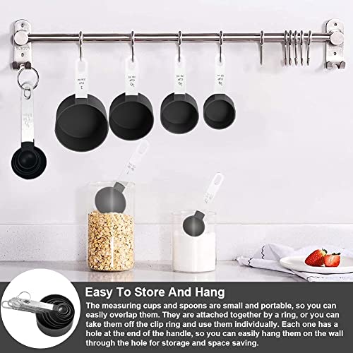 HAOMEEDUO Set di 8 Misurini e Cucchiai Dosatori in Plastica con Manico in Acciaio Inox Misurini Neri da 2.5ml/ 5ml/ 7.5ml/ 15ml e Cucchiai da 59ml/ 78ml/ 118ml/ 236ml con 1 Imbuto per Cucina