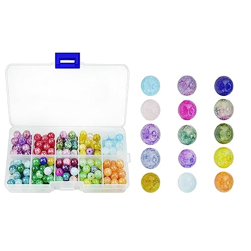 【200 PERLINE DI VETRO COLORATE 8MM】: Ricevi un set completo di 200 perline di vetro incrinate con un diametro di 8 mm, confezionate in una pratica scatola di plastica a 10 scomparti per un facile e ordinato stoccaggio. Questo kit di perline di vetro offre una varietà di opzioni per soddisfare tutte le tue esigenze creative, permettendoti di realizzare i tuoi progetti artigianali ovunque tu sia.