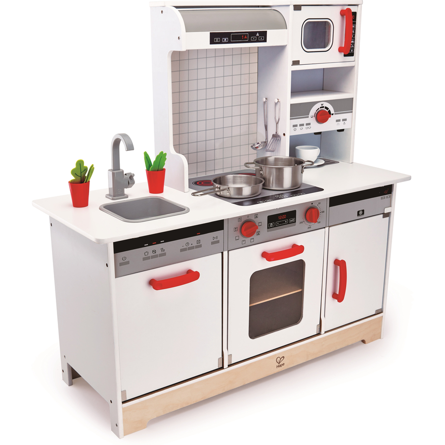 Con questa cucina il divertimento è assicurato! I bambini si divertiranno con questa completa cucina multifunzione e il suo corredo di apparecchi e funzionalità, tra cui una vera lampada sulla cappa e l'autentico ding del microonde. Chiedi al bambino di prepararti un pranzo completo, o invita un suo amico per un fantastico gioco di ruolo! Dettagli: Materiale: Legno, colori ad acqua, metallo, pp Età: a partire da 3 anni Dimensioni montato (lunghezza x larghezza x altezza): 97 x 37 x 97 cm Peso: 18,76 kg Pezzi: 15 pezzi Contiene: Piantine, pentole, utensili da cucina, tazze e posate. Attenzione Non adatto a bambini di età inferiore ai 3 anni, contiene piccole parti. Pericolo di soffocamento.