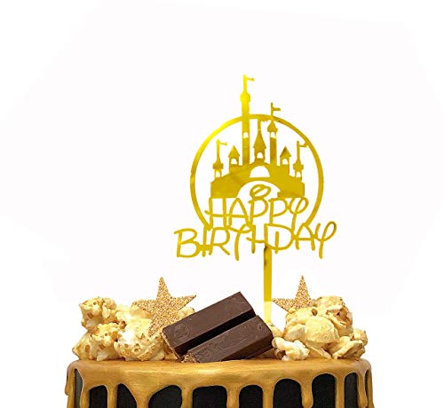 Design raffinato: Topper decorativo per torta bifacciale con glitter lucido a forma di castello da favola con lettera "Happy Birthday". (La pellicola protettiva è attaccata su entrambi i lati, si prega di strapparli prima dell'uso)