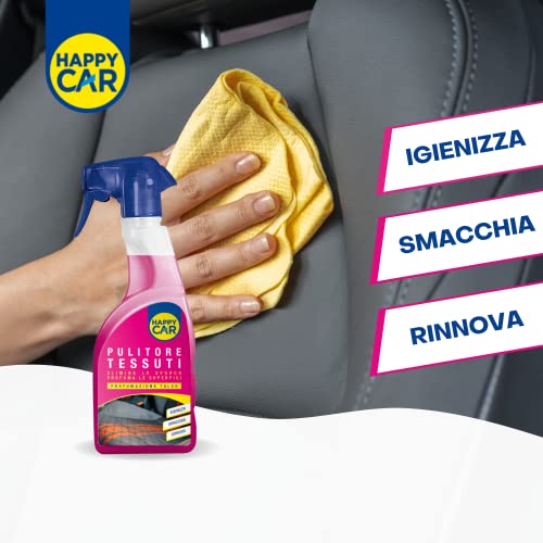 Happy Car - Pulitore Tessuti Interni Auto, Deterge, Smacchia, Tutte Le Tipologie di Tessuto, profuma di Talco, Spray 750ml