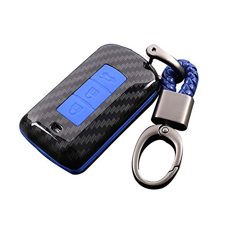 Happyit - Custodia in silicone per chiave in fibra di carbonio ABS + portachiavi per Mitsubishi Outlander Lancer 10 EX Pajero Sport ASX RVR L200, 3 pulsanti (blu)