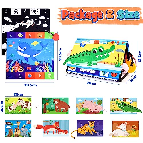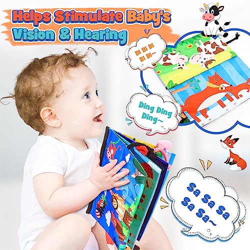 【Allenamento dell'attività Sensoriale】Il libro di stoffa presenta 7 code di animali che offrono un sacco di divertimento da toccare. Quando il bambino gira o preme il dispositivo BB nel libro di stoffa, emette suoni di scricchiolio, cigolio o campanello, utili per la stimolazione uditiva. I simpatici disegni ad alto contrasto stimolano lo sviluppo visivo del bambino e lo aiutano a riconoscere i colori.