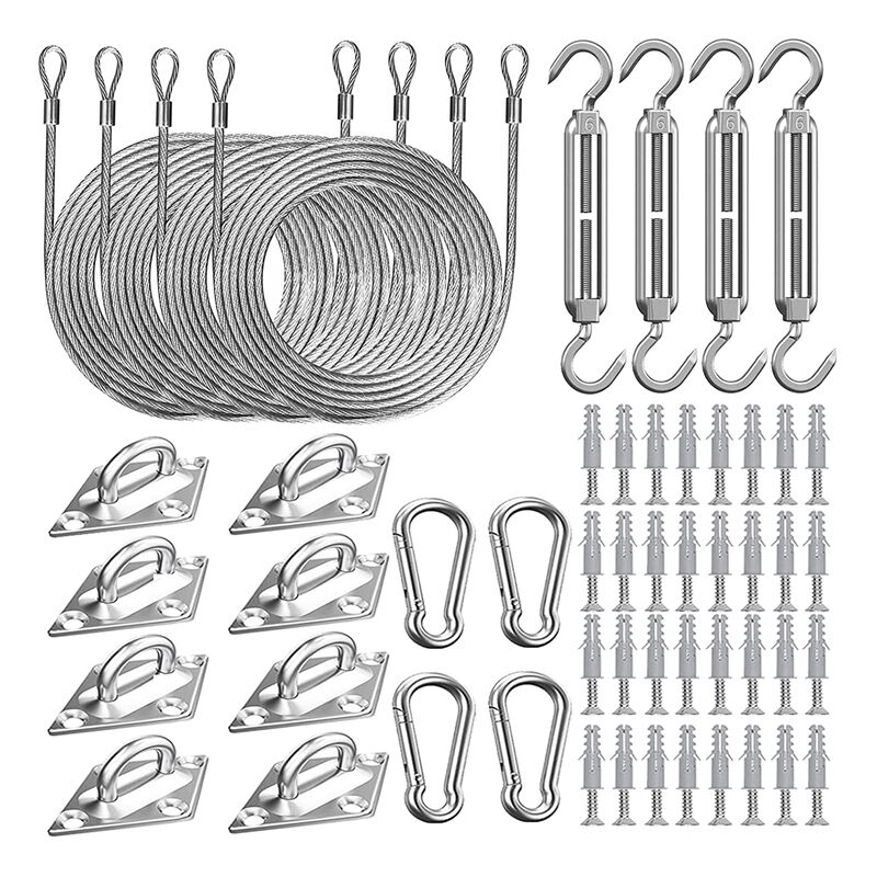 84 Pcs Tenda Da Sole A Vela Ferramenteria E Attrezzi Kit Con Cavo di Filo di Corda Per Tenda A Vela di Installazione, Per Il Giardino, all'aperto, Ringhiera [Di alta-Qualità Materiale]: il nostro 6 pollici/M6 tenda da sole a vela kit di installazione è fatta di alta-qualità in acciaio inox per la ruggine E resistenza alla corrosione. Il kit hardware è perfetto per tutte le quadrato/rettangolo/triangolo tenda da sole a vela e si può montare tra gli alberi, da parete a parete, da parete a albero, da parete a un palo o ovunque si desideri, adatto per apparecchi di settori ventose o di grandi dimensioni come ad esempio tenda da sole, baldacchino.[84 Pcs Tenda Da Sole Ferramenteria E Attrezzi Kit con Cavo]: include 12ft aircraft cavo di filo di corda x 4 pcs, tenditore gancio per gancio x 4 pcs, A molla a scatto gancio/moschettone clip di x 4 pcs, pad diamante piastra occhio x 8pcs, vite x 32pcs, di espansione in plastica/ancoraggio x 32pcs, adatto per l'installazione di triangolo