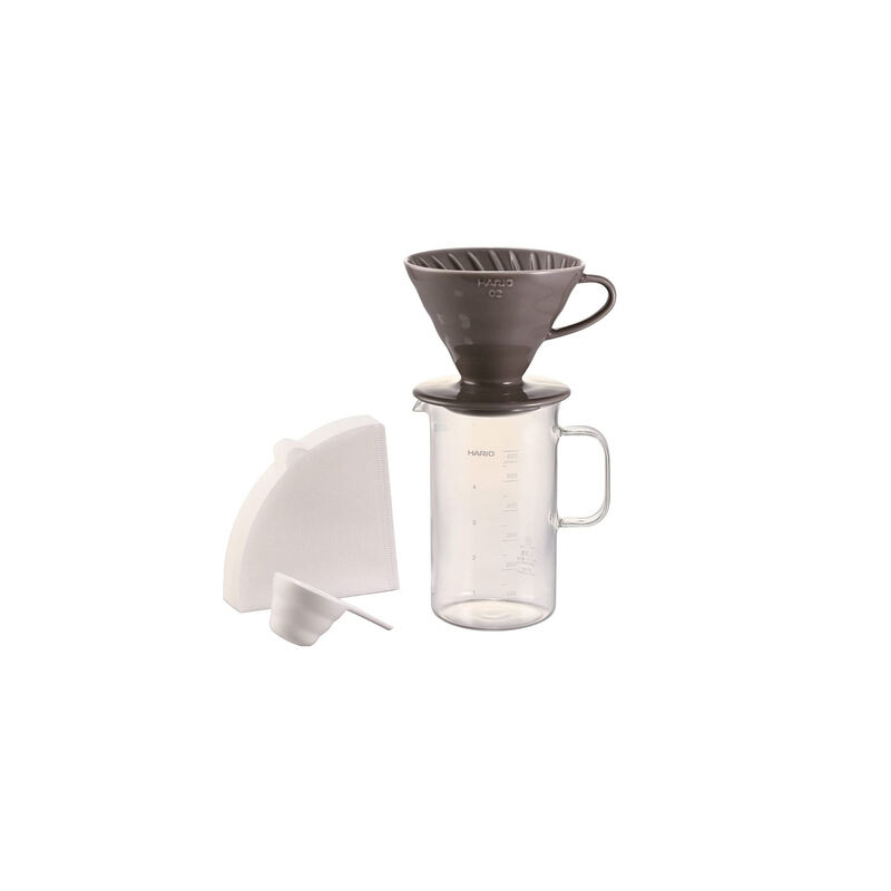 Il set comprende: - Drip in ceramica Hario V60-02 Grigio (VDC-02-GR-EX): Dripper è un preparatore manuale per la preparazione del caffè utilizzando il metodo pour-over, realizzato in porcellana di alta qualità e facile da usare. Perfetto per chi ama il buon caffè, il bel design e i gadget. Hario V60-02 ti consente di preparare il caffè per una o più persone alla volta. La versione in ceramica è un design elegante disponibile in diversi colori che decorerà sicuramente qualsiasi cucina. Inoltre è caratterizzato da un ottimo livello di ritenzione del calore. La forma conica e le speciali scanalature all'interno del gocciolatore garantiscono un ottimo flusso d'acqua. Per preparare un caffè delizioso, abbiamo bisogno di caffè di alta qualità appena macinato, un filtro, una pala e una bilancia. Il filtro viene inserito in un gocciolatore, che viene posizionato su un piatto da portata del caffè. La preparazione dell'infusione richiede solo 3 - 4 minuti. - Hario - Craft Science Beaker Server