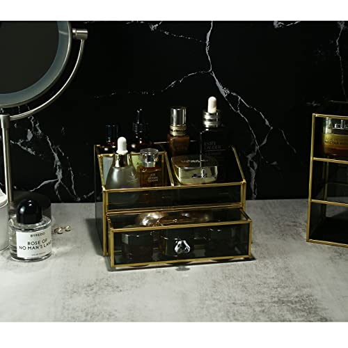 HARLIANGXY - Organizer per cosmetici, con cassetto, per trucchi, colore oro, vintage, in metallo e vetro, nero