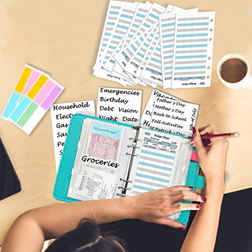 Sistema di budgeting in contanti incluso: 1 cartella per taccuini in tessuto di feltro, 8 buste A6 con cerniera, 12 fogli di carta A6, 2 x 6 etichette adesive impermeabili, 4 fogli di adesivi di classificazione autoadesivi.