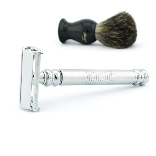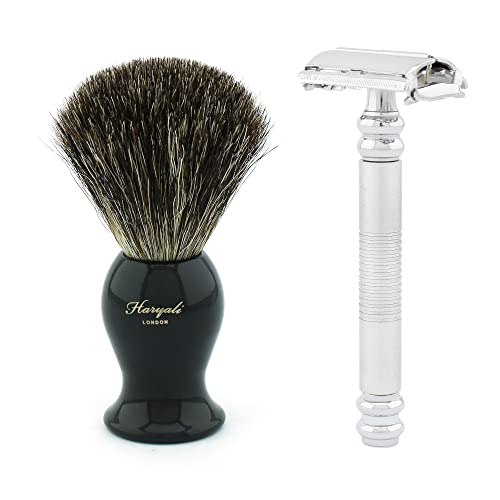 Haryali London assemblato a mano argento doppio bordo rasoio di sicurezza farfalla & nero. Pennello per rasatura