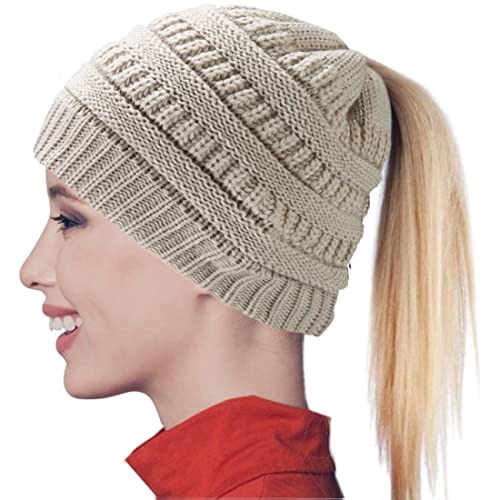 Hatstar Berretto invernale da donna con foro per coda di cavallo o treccia, morbido e caldo, beige., M