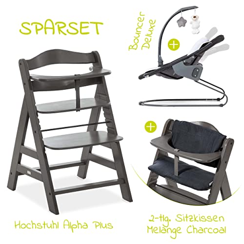 Hauck Alpha Plus Newborn Set Deluxe - Seggiolone Legno dalla Nascita - Sedia Bambini con Sdraietta Dondolo, Reclinabile e Cuscino - Carbone