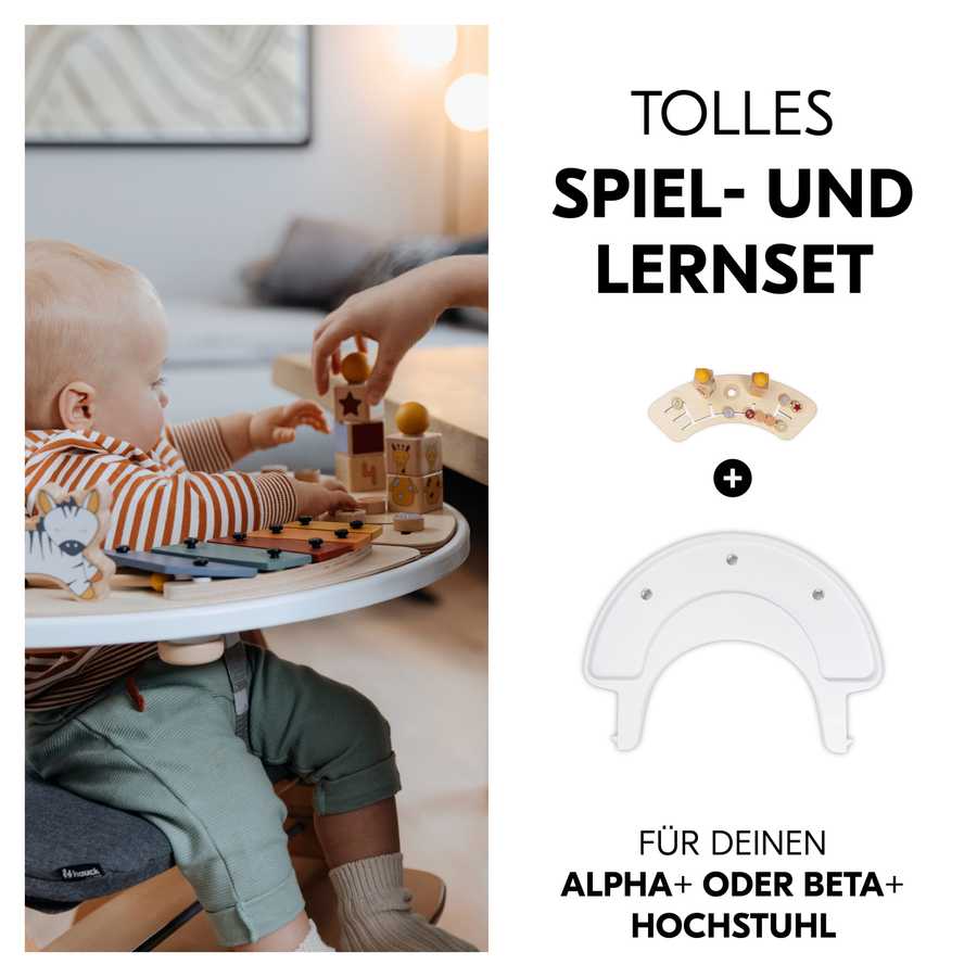 Dettagli del prodotto: Anello per la motricità e base per il gioco del vassoio per i seggioloni hauck Alpha, Alpha +, Beta e Beta+ Indicazione di età: da 12 mesi Divertimento colorato sul seggiolone per promuovere il pensiero logico e la motricità fine. Può essere facilmente agganciato e rimosso dalla barra anteriore del seggiolone con un solo clic Il tavolo da gioco si fissa alla base con una vite di legno in un batter d'occhio Il tavolo da gioco può essere combinato con un massimo di due set di gioco Sostenibile e durevole, grazie al legno certificato FSC®. Facilissimo da tenere pulito grazie alla superficie liscia e lavabile Materiale e cura:<