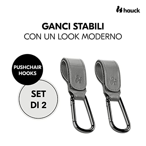 Hauck Ganci Passeggino Porta Borse - Ganci per Passeggino in Similpelle con Moschettone, Misura Universale per Carrozzine e Passeggini - Confezione da 2 - Grigio