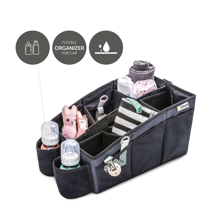 HAUCK Portaoggetti Organize Me per sedile posteriore auto Questo portaoggetti sta perfettamente, tra due posti, sul sedile posteriore della vostra auto. L´Organize Me è abbastanza capiente per riporre oggetti vari nei 6 scomparti interni, 2 portabottiglie e nelle tasche a rete. Ha un pratico manico per agevolarne il trasporto. Il portaoggetti è costituito da materiale resistente, impermeabile e antiscivolo. Si fissa alla cintura di sicurezza. Piegato occupa poco spazio e può essere riposto, comodamente, nel veicolo. •