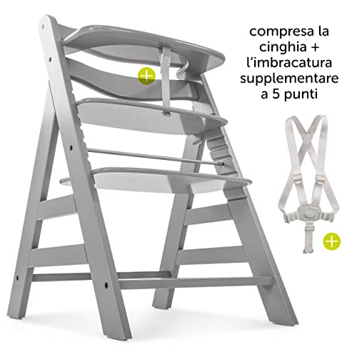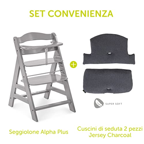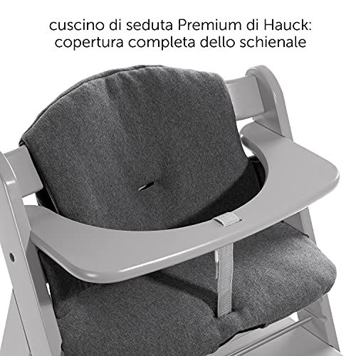 Hauck Seggiolone Alpha Plus - Seggiolone Pappa in Legno Evolutivo con Imbracatura a 5 punti, Barra di Protezione e Cuscino Premium - Grigio Carbone