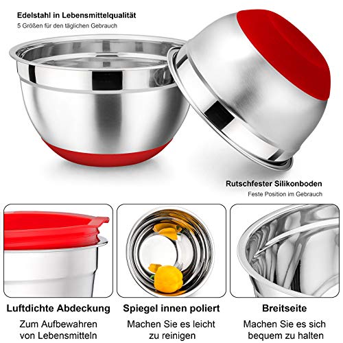 HaWare - Set di 5 ciotole per insalata in acciaio inox, con coperchio e fondo in silicone, impilabili e versatili, lavabili in lavastoviglie, 7,6 l, 4,7 l, 2,8 l, 2,4 l, 1,4 l, colore: Rosso
