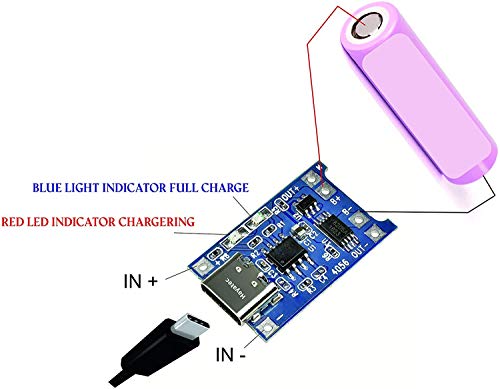 Corrente: 1 A regolabile. | Tensione di ingresso: 4,5 V-5,5 V | Tensione di carica completa: 4,2 V. | Indicatore LED: rosso è in carica/blu o verde indica completamente carica. | Interfaccia di ingresso: USB di tipo C. | Polarità in-versed - NO.
