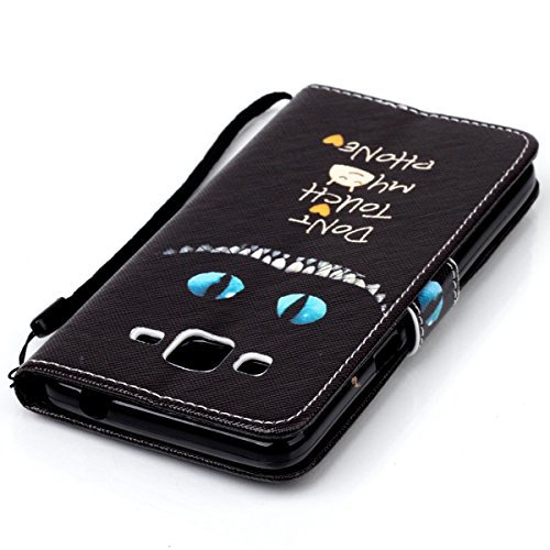 HB-Int 4 in 1 Funny Devil Custodia Borsa Dark per Smartphone Samsung Galaxy Grand Prime G530 G530H G530FZ G5308W G5309W G5306W Nero PU Pelle Stand Caso Copertura della Cassa con Strap Protezione Leather Flip Case Cuoio Book Style con Chiusura Magnetica + 1 x Stilo + 1 x HD Protezione dello Schermo +1 x Spina della Polvere