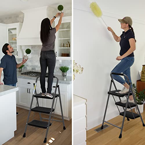 Sicurezza e stabilità: il telaio in acciaio di alta qualità è costruito con resistenza e affidabilità. Fibbia sicura in metallo bloccata automaticamente in posizione quando si utilizza la scala a gradini. La struttura del tutore trasversale posteriore rafforza il supporto di base che ti farà sentire più sicuro salendo la scala.
