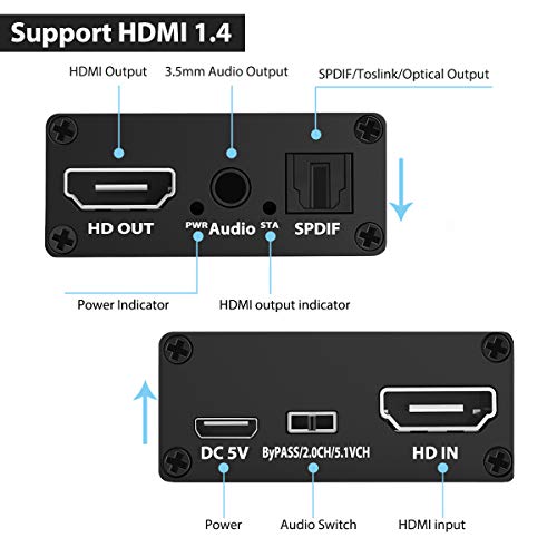 【Estrattore audio HDMI 1.4】 Conforme allo standard HDMI 1.4 / HDCP1.4. Separare i segnali audio e video HDMI in video, un canale di audio ottico digitale 5.1CH e un canale di audio stereo. Eccellenti capacità di elaborazione di immagini e audio, che rendono la trasmissione del segnale più fluida e stabile.