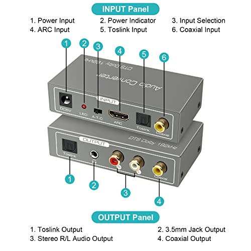 ✔【Nota】Convertitore da digitale ad analogico a 192 kHz supporta il formato audio DTS / Dolby AC3 / LPCM2.0, ma utilizza Toslink o l'interfaccia coassiale per supportare DTS / Dolby AC3. . Supporta frequenze di campionamento di 96 kHz e persino 192 kHz. Se si utilizza un jack stereo R / L o da 3,5 mm, questa unità supporta solo l'ingresso in formato audio LPCM / PCM e non supporta l'ingresso audio 5.1 o 7.1.