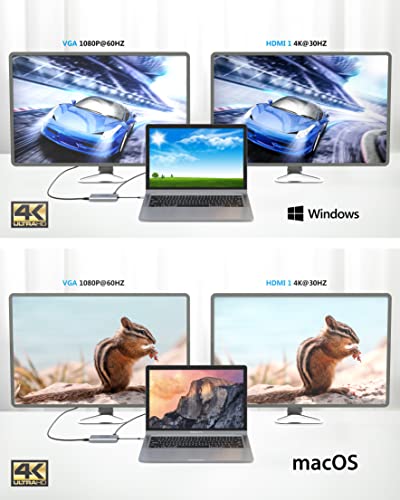 [USB c port replicator]: utilizzo della porta HDMI e dello schermo di espansione streaming 4K UHD@30Hz o tutti HD 1080p@60Hz Il video viene inviato direttamente all'HDTV, allo schermo o al proiettore. Poiché è compatibile con la porta Thunderbolt-to-HDMI, si ottiene un effetto di sincronizzazione video vivido. Ideale per la trasmissione di film HD completi su HDTV, l'espansione di videogiochi su schermo o la visualizzazione di ppt su un proiettore per riunioni in ufficio e intrattenimento.